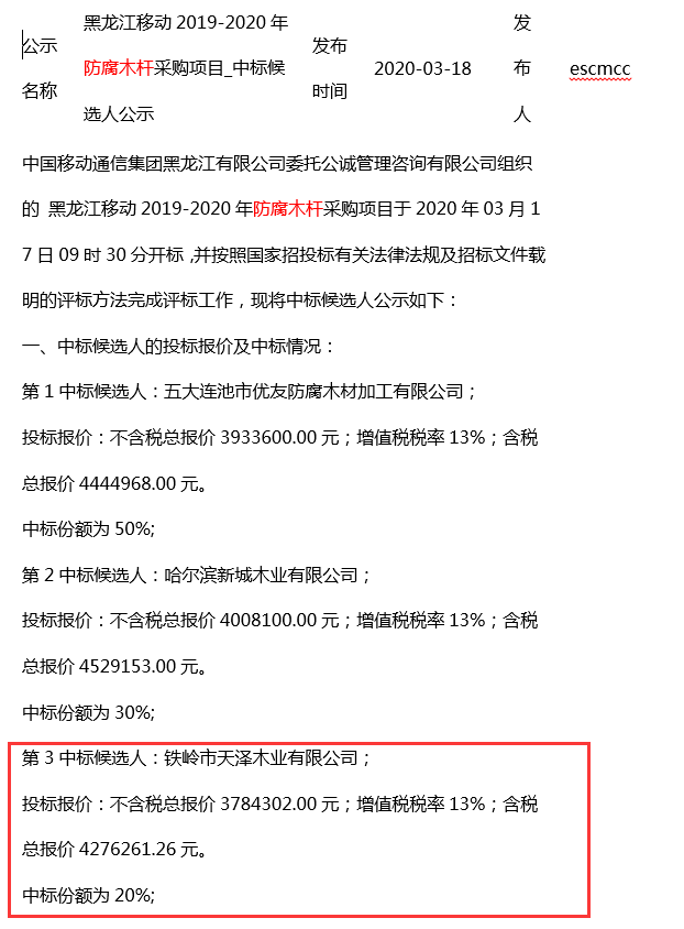 天澤木業在黑龍江移動新年度防腐木桿采購項目中中標
